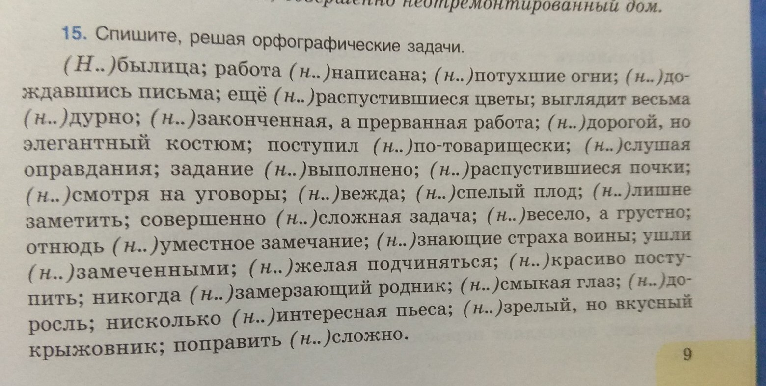 Небылица; работа не написана; непотухшие огни; не дождавшись письма; ещё не распустившиеся цветы; выглядит весьма недурно; не законченная,а прерванная работа; недорогой,но элегантный костюм; поступил не по-товарищески; не слушая оправдания; задание не выполнено; нераспустившиеся почки; несмотря на уговоры; невежда; неспелый плод; нелишне заметить; совершенно несложная задача; не весело,а грустно; отнюдь неуместное замечание; не знающие страха воины; ушли незамеченными; не желая подчиняться; некрасиво поступить; никогда не замерзающий родник; несмыкая глаз; недоросль; нисколько неинтересная пьса; незрелый,но вкусный крыжовник; поправить несложно.