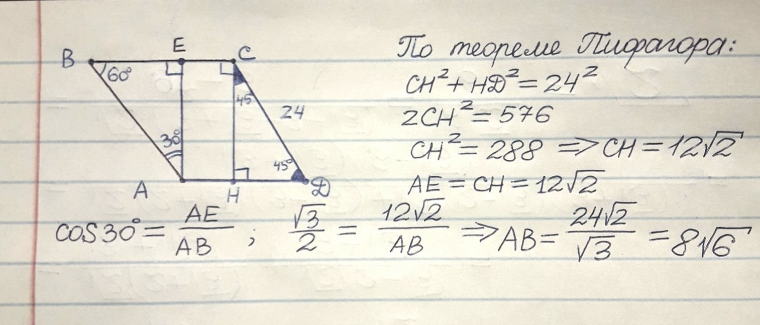 AB = AE / cos30° = 24•cos45° / cos30° = ( 24 • /2 / 2 ) / ( /3 / 2 ) = 24• /2 / /3 = 8•/6