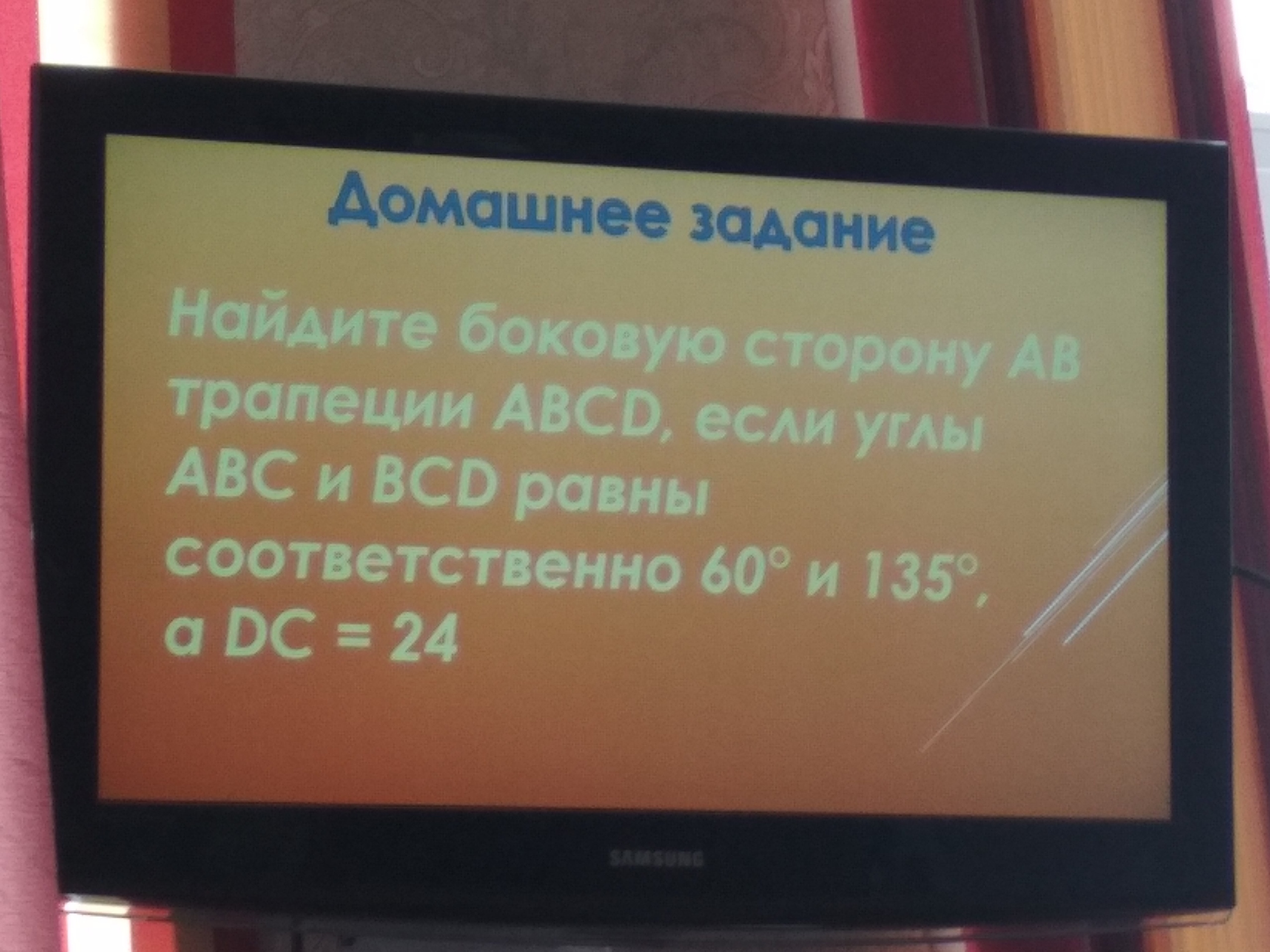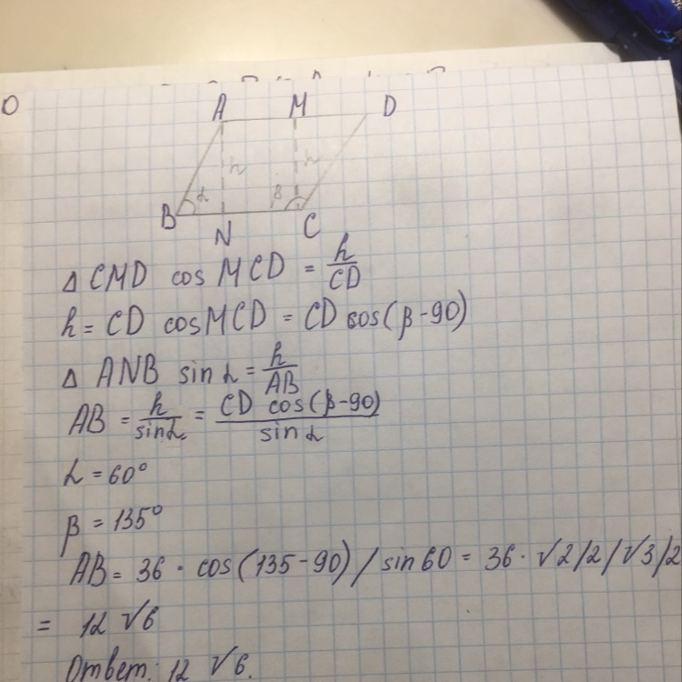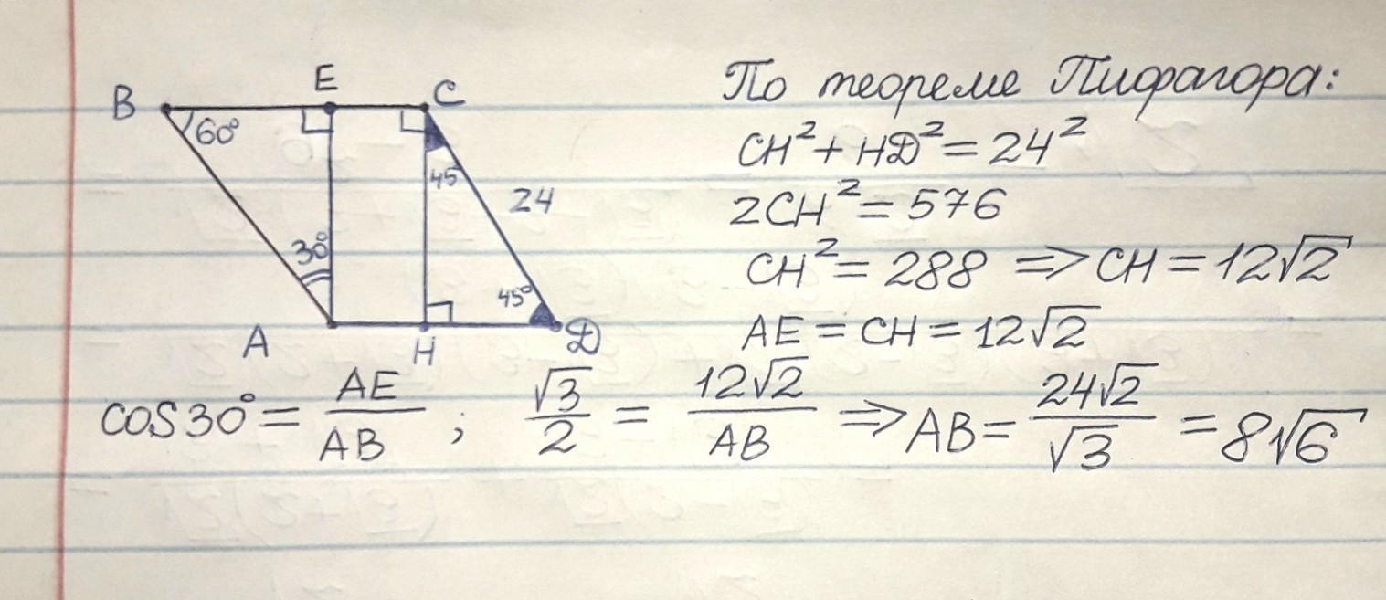 AB = AE / cos30° = 24•cos45° / cos30° = ( 24 • /2 / 2 ) / ( /3 / 2 ) = 24• /2 / /3 = 8•/6