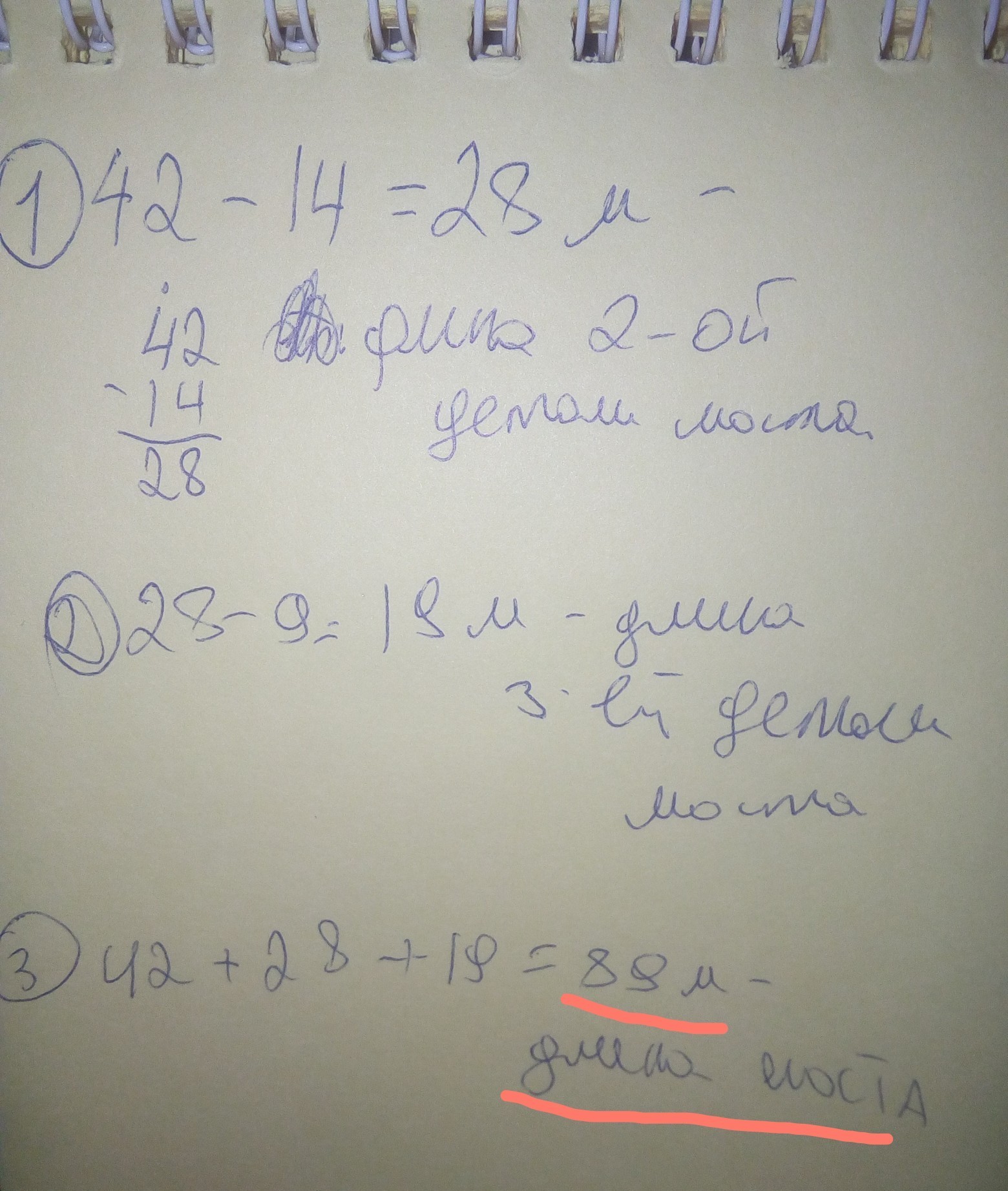 решить задачу длина одной детали моста равна 42метра вторая на 14метров меньше первой и на 9 больше третьей найти длину моста