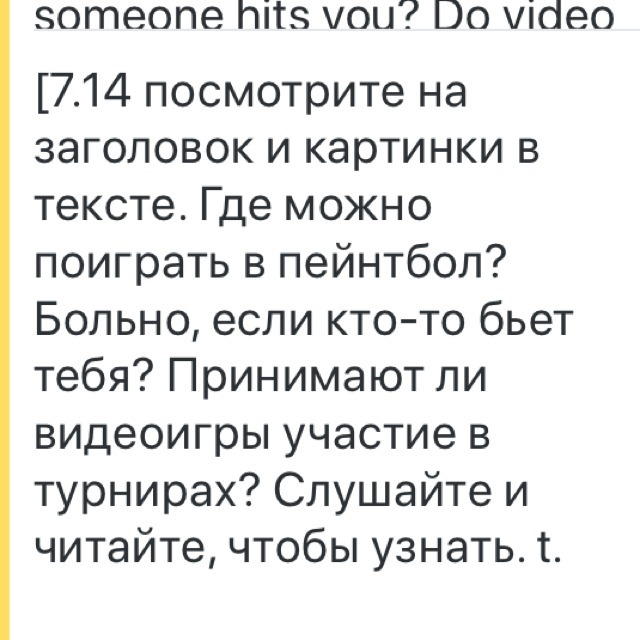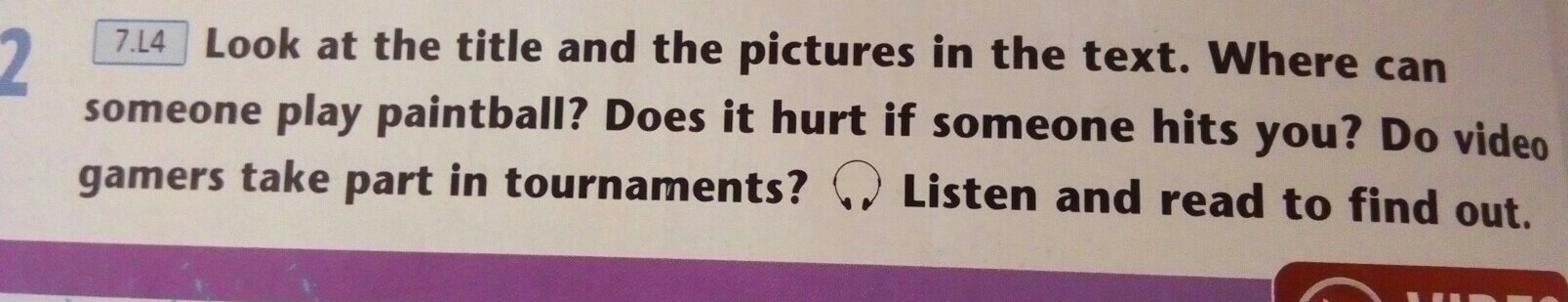 Посмотри название и рисунки в тексте. Где-то кто-то может играть в пейнтбол? Тебе больно, если кто-то бьёт тебя? Геймеры принимают участие в видеоиграх? Слушай и читай, чтобы узнать про все это.