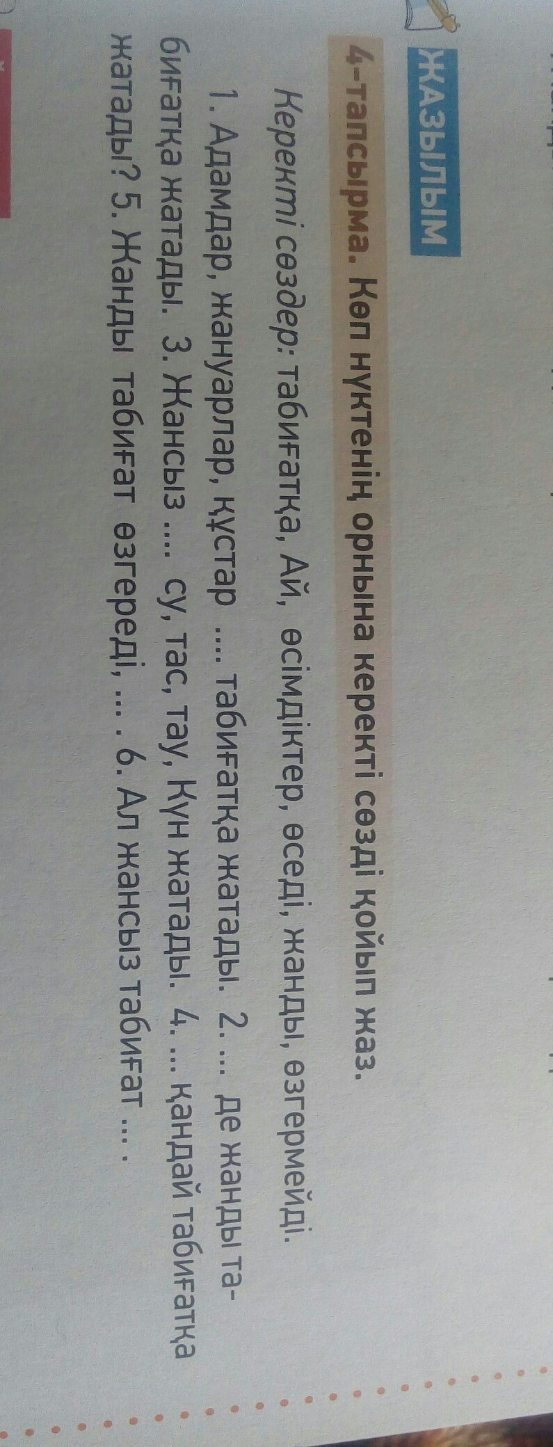 1. Adamdar, janwarlar, kustar jandı tabiygatka jatadı. 2. Ösimdikter de jandı tabiygatka jatadı. 3. Jansız tabiygatka suw, tas, taw, Kün jatadı. 4. Kansız kanday tabiygatka jatadı? 5. Jandı tabiygat özgeredi, özgermeydi. 6. Al jansız tabiygat Ay