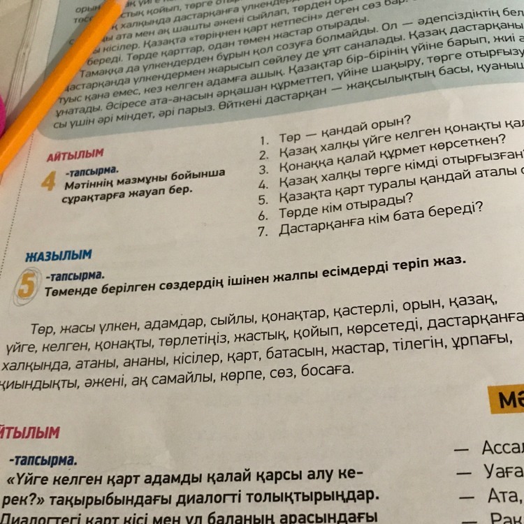 төр, адамдар, қонақтар, орын, қазақ, жастық, кiсiлер, қарт, жастар, көрпе, сөз, босаға.