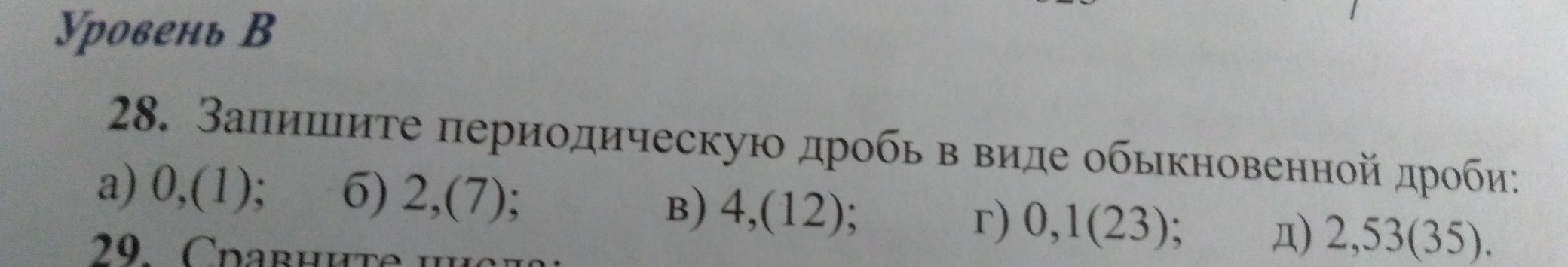 запишите переодическую дробь в виде обыкнлвенной дроби:а) 0,(1).б)2,(7)в)4,(12).г)0,1(23).д)2,53(35).?