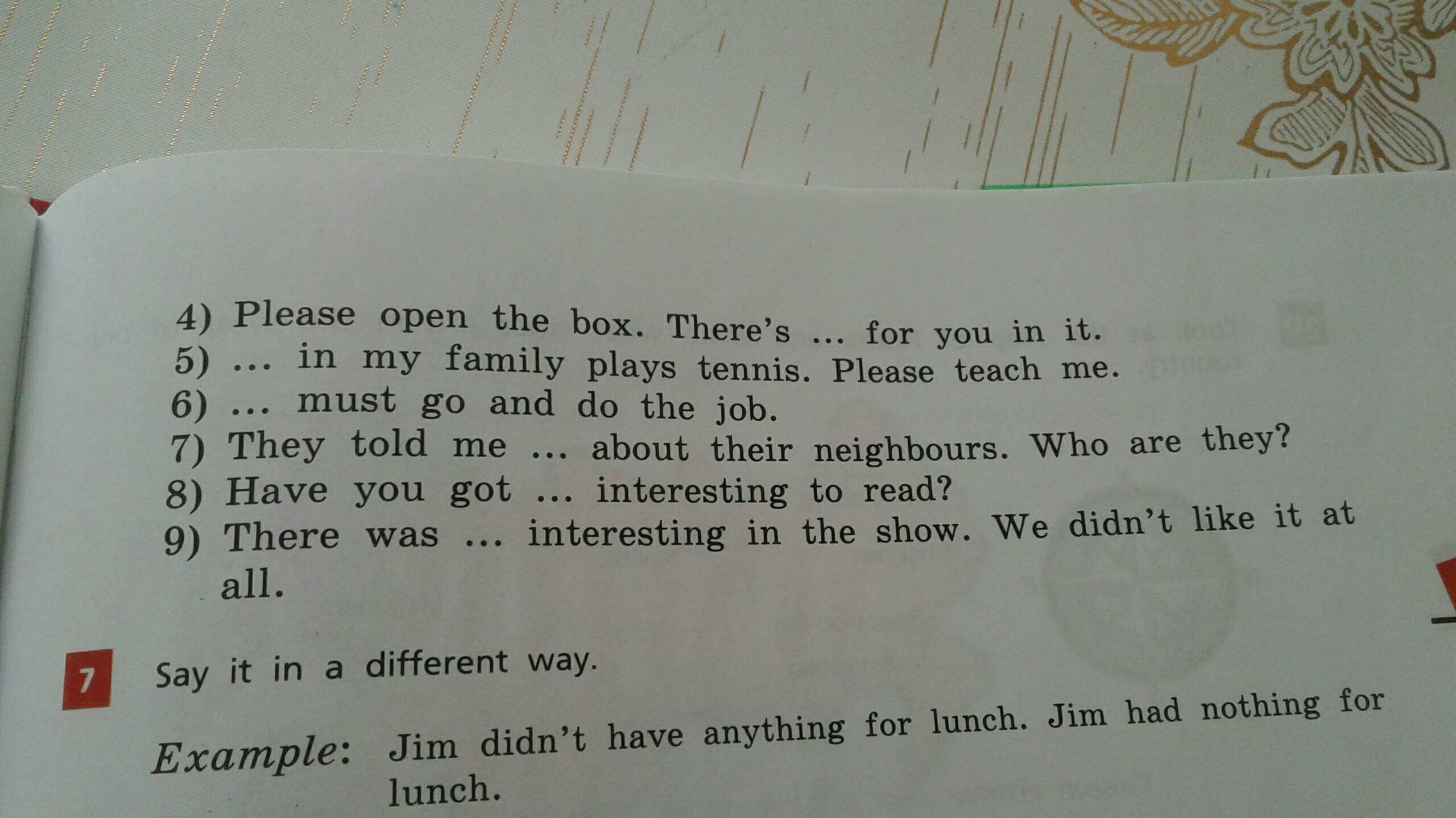 2)nobody in my family plays tennis.Please teach me