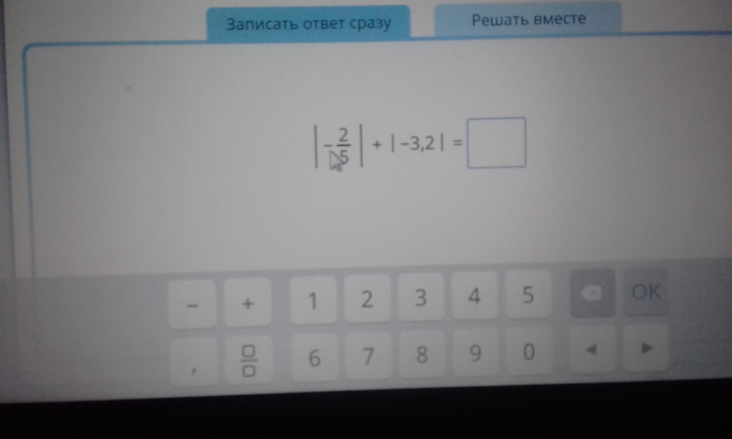 |-2/5| +|-3,2| = 2/5+3,2 =2/5+32/10 = 2/5+16/5= 18/5