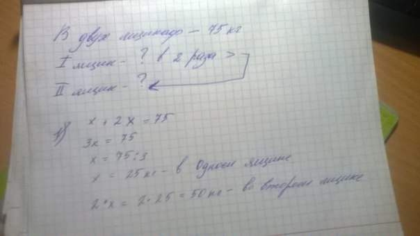 У першому ящику в 5 раз більше ніж у другому. Коли з першого взяли 25кг мандаринІв, а у другий поклали ще 15кг мандаринів, то в обох стало порівну. Скільки кг мандаринів було в кожному ящику спочатку?