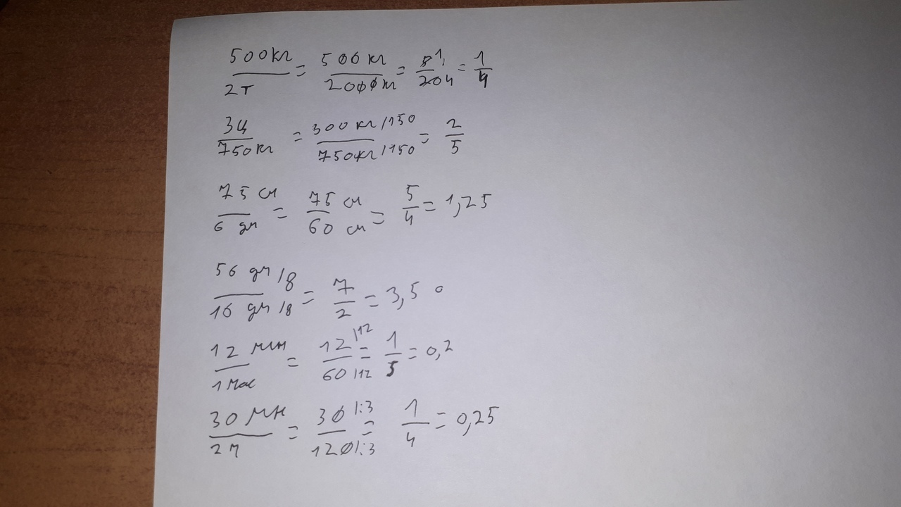 1)...=0,5т/2т=1/8 2)...=3ц/7,5ц=2/5 3)...=75см/60см=15/12=5/4 4)...=7/2 5)...=12мин/60мин=1/5 6)...=30мин/120мин=1/4