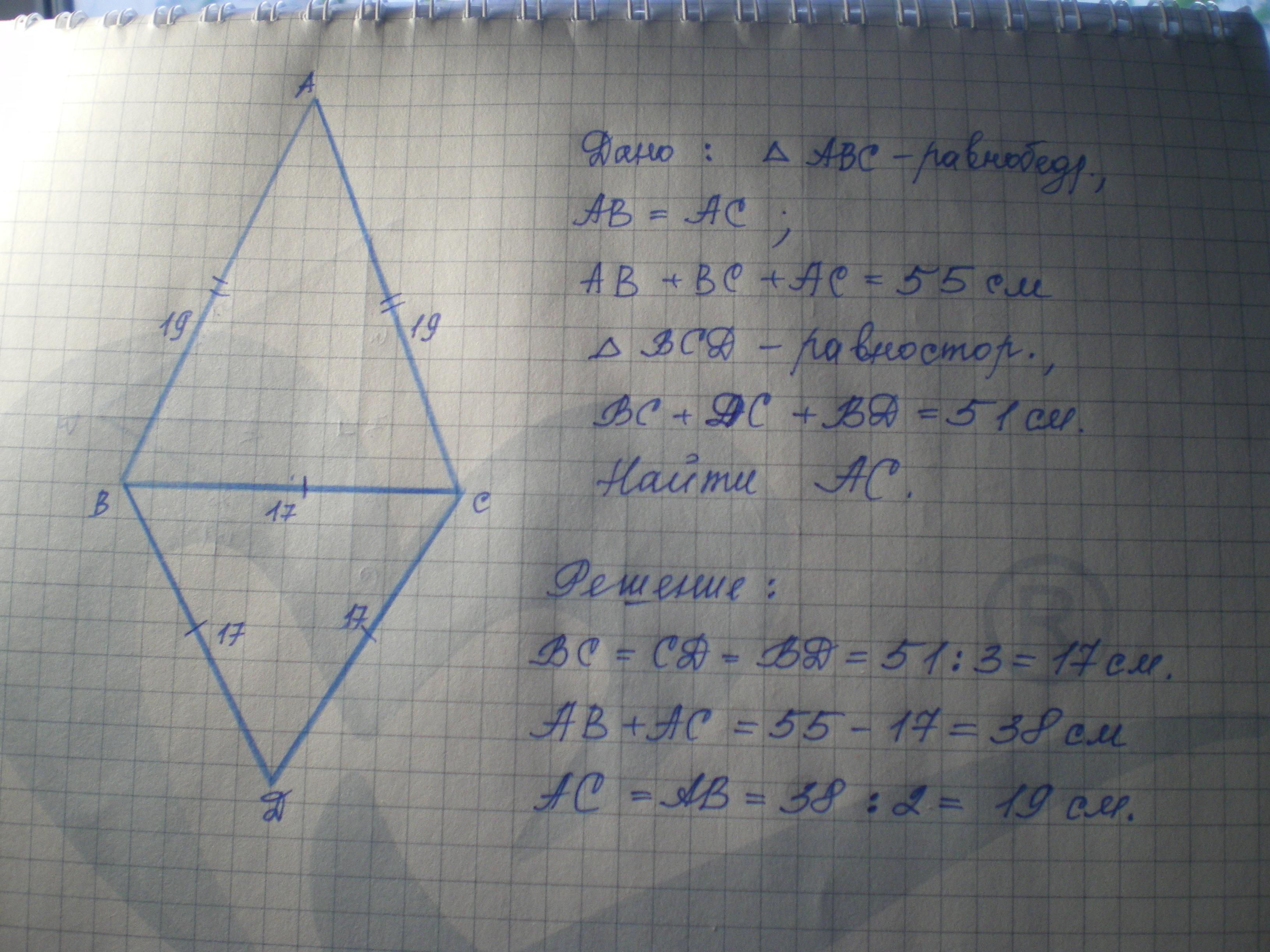 Периметр равнобедренного треугольника ABC с основанием BC равен 55 см, а периметр равностороннего треугольника BCD равен 51 см. Найдите сторону AC