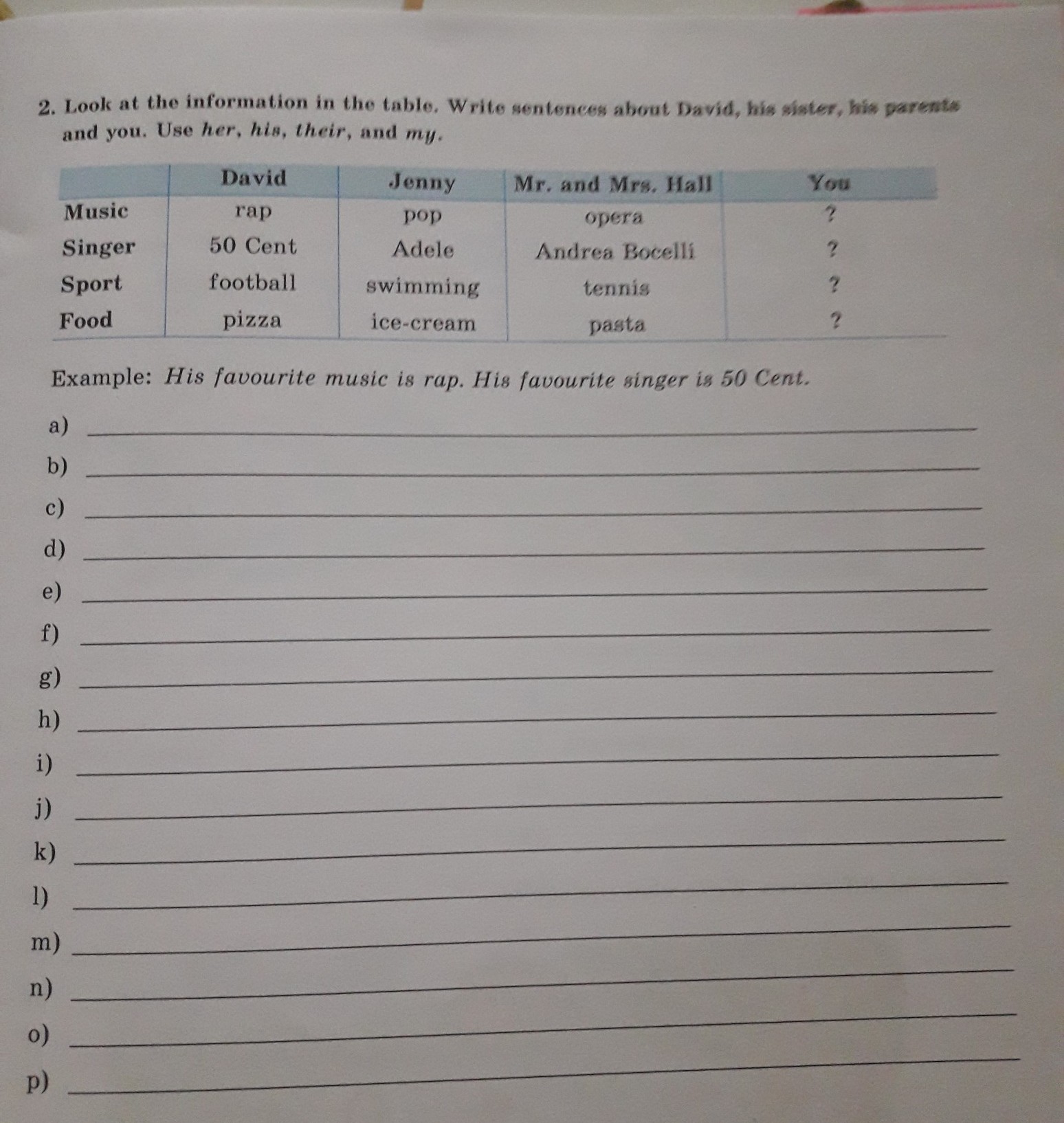 Their (Mr. and Mrs. Hall) favourite music is opera. Their favourite singer is Andrea Bocelli. Their favourite sport is tennis. Their favourite food is pasta.