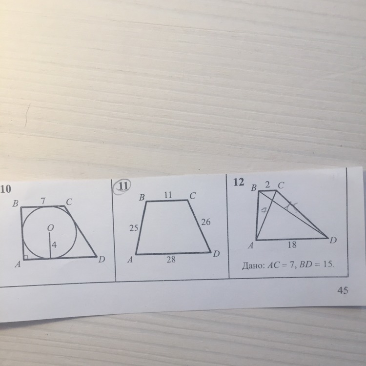 11. АН=х, РD = (28-11)-х или PD=17-х. ВН=СР - высоты трапеции. Из прямоугольных треугольников по пифагору: 25²-х² = 26²-(17-х)². Отсюда х=7. Тогда высота трапеции равна √(625-49)=24 и площадь трапеции равна Sabcd= (28+11)*24/2 = 468 ед².