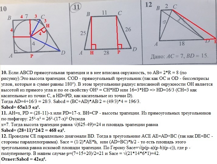 12. Проведем СЕ параллельно диагонали BD. Тогда в треугольнике АСЕ АЕ=AD+BC (так как DE=BC - стороны параллелограмма). Sace = (1/2)*AE*h, или (AD+BC)*h/2 - то есть площадь этого треугольника равна искомой площади трапеции. По Герону Sace=√(p(p-a)(p-b)(p-c)), где р - полупериметр. В нашем случае p=(7+15+20)/2=21 и Sace = √(21*14*6*1)=42.