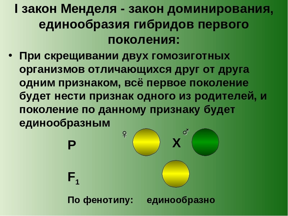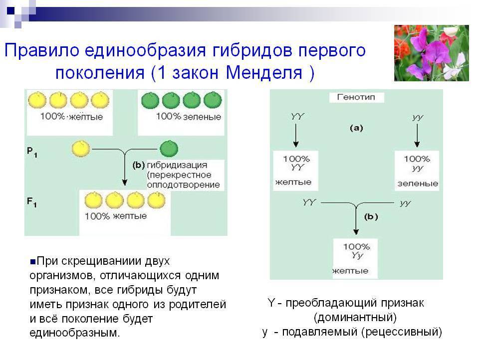 Жёлтые семена доминируют над зелеными. Согласно первому закону Менделя, если родители отличаются друг от друга одним признаком, у поколения проявится доминантный признак одного из родителей. Генотип поколений будет Aa( гетерозиготное поколение) Во 2 поколении проявится расщепление. По фенотипу 3:1, по генотипу 1:2:1