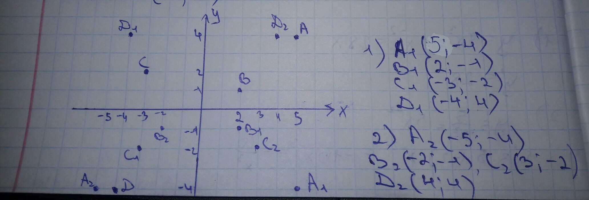 Даны точки А(5;4), B(2;1),С(-3;2),D(-4;-4). Построить точки,симметричные им: 1) относительно оси Ox; 2) относительно точки (0;0). Определить координаты полученных точек