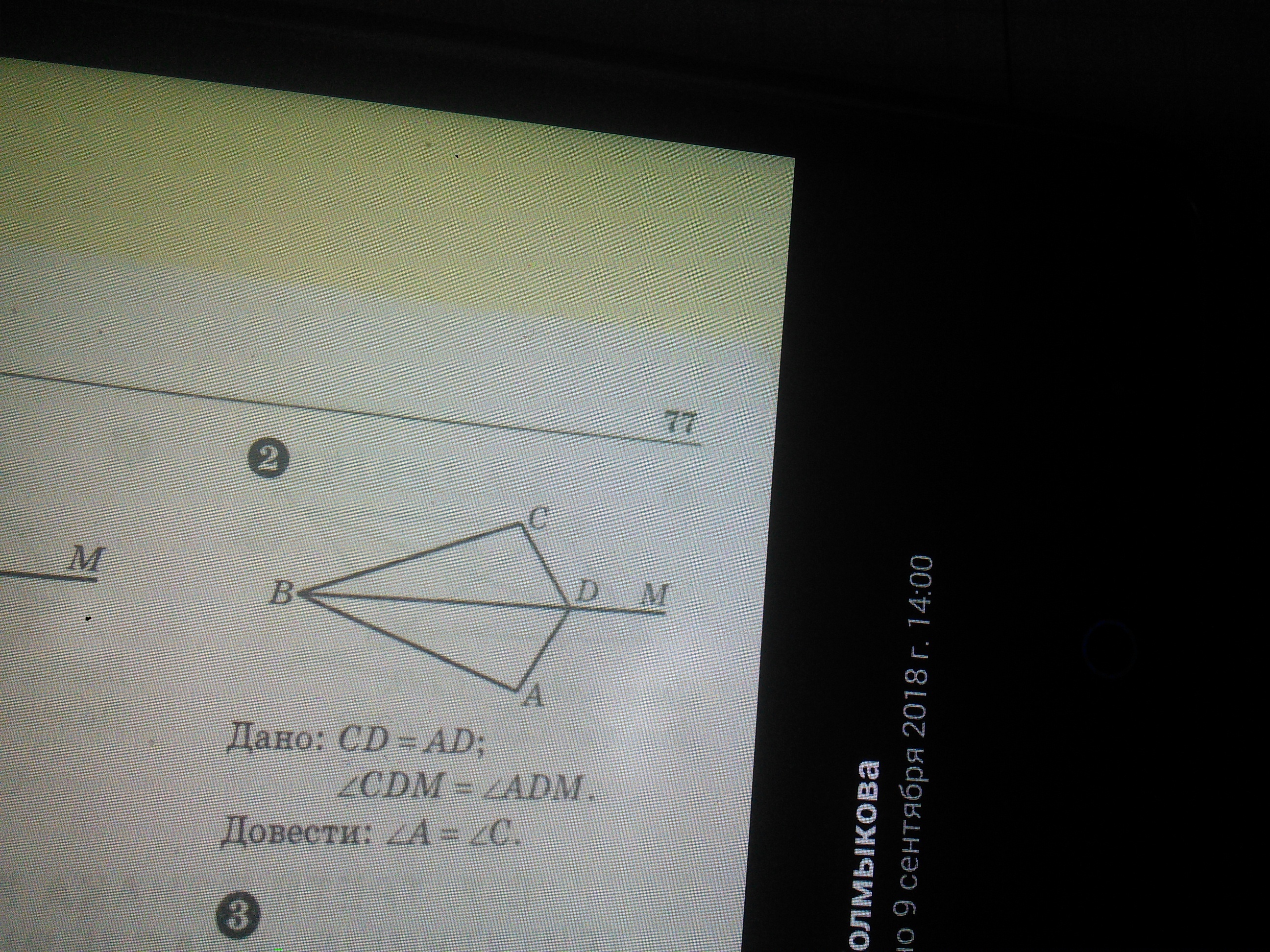У трикутників ВСД і ВАД: ВД - спільна сторона; СД = ДА (за умовою задачі); ∠СДА = ∠АДМ (як кути, суміжні до рівних кутів СДМ і АДМ). Звідси, ΔВСД = ΔВАД за І ознакою рівності трикутників.