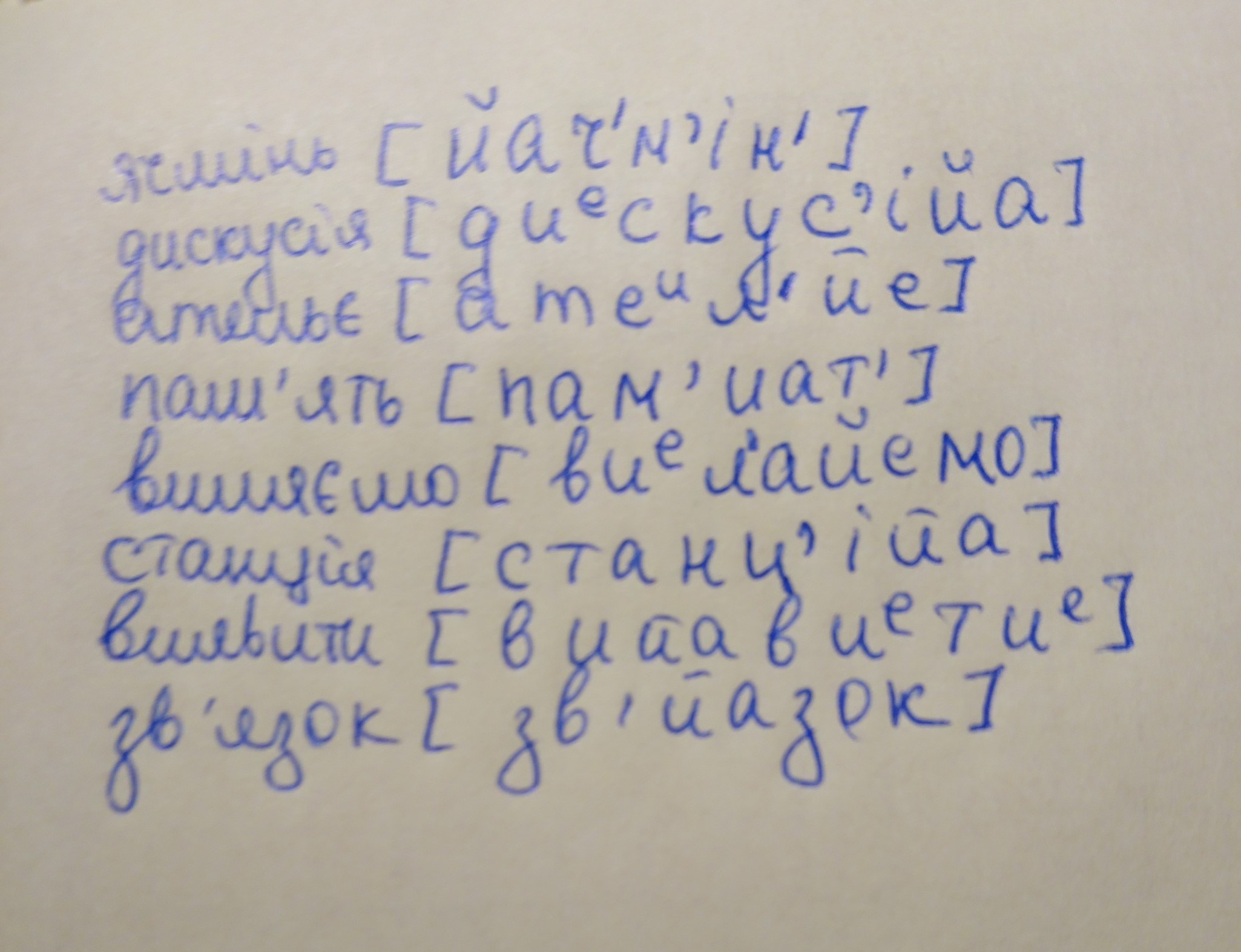 транскрипція слів: ячмінь,дискусія,ательє,пам'ять,виляємо,станція,виявити,зв'язок