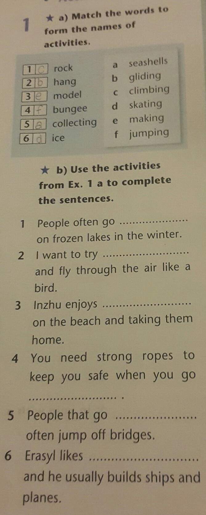 1. Ice skating 2. Hang gliding 3. Collecting seashells 4. Rock climbing 5. Bungee jumping 6. Model making