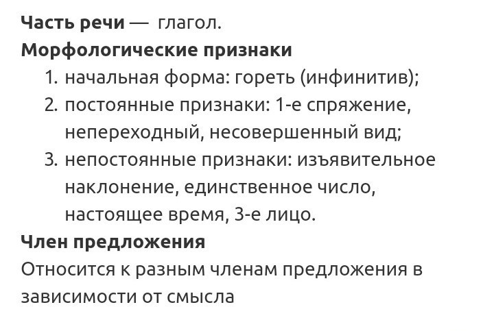 Постоянные признаки: 1-е спряжение, непереходный, несовершенный вид;
