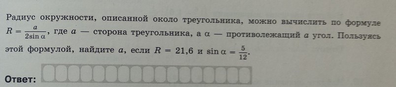 R = frac{a}{2 sinalpha } = > \ = > a = 2Rsinalpha = \ = 2 times 21.6 times frac{5}{12} = \ = frac{5times 21.6}{6} = 18