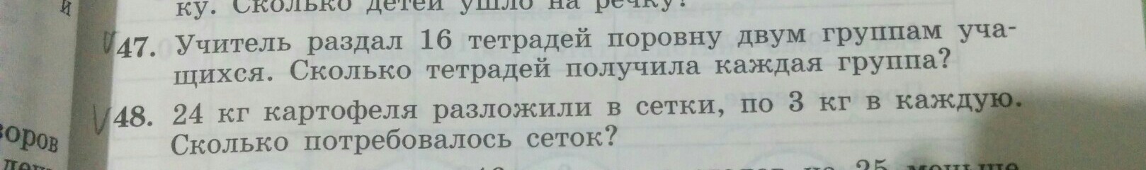 Учитель роздал 16 тетрадей поровну двум группам , нужно разделить 16 : 2 = 8 если так учитель роздал по 8 тетрадей группу