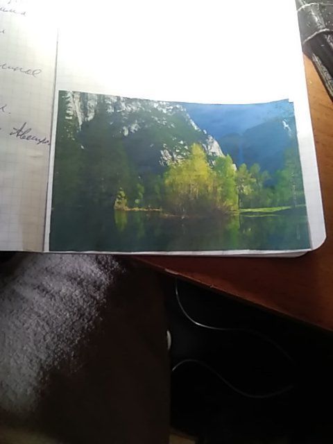 Что изображено впереди картины? Какие деревья на ней нарисованны? Солнечная ли погода? Сколько гор на картине? Есть ли водопад на рисунке?