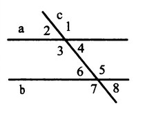 При пересечении двух параллельных прямых третьей (не под прямым углом) образуются 8 углов, четыре из которых имеют одну величину и четыре - другую: