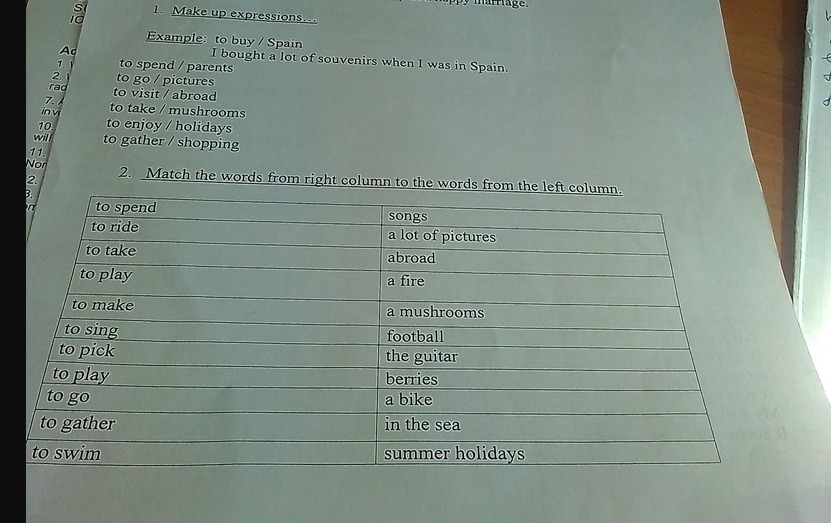 to spend summer holidays ; to ride a bike; to take a lot of pictures ; to play the guitar; to make a fire; to sing songs; to pick berries; to play football; to go abroad; to gather mushrooms; to swim in the sea.