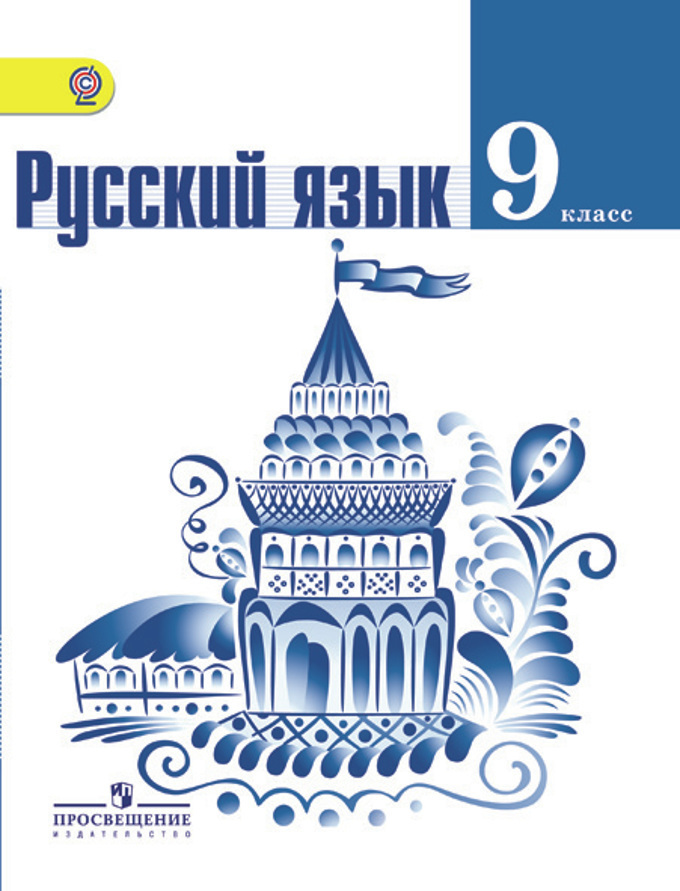 Обыкновенный учебник русского языка 9 класса, издание"ПРОСВЕЩЕНИЕ". Основной цвет учебника белый с синим. По центру мы видим рисунок по типу гжельской росписи в синих тонах, чуть выше от рисунка есть большая, жирная, тёмно-синего цвета надпись "Русский язык", правее от надписи есть большой синий квадрат, на котором белым цветом написано следующее "9 класс". Сам учебник выглядит опрятно, гжельская роспись дополняет учебник и показывает, что наш почерк красивый так же как и язык.