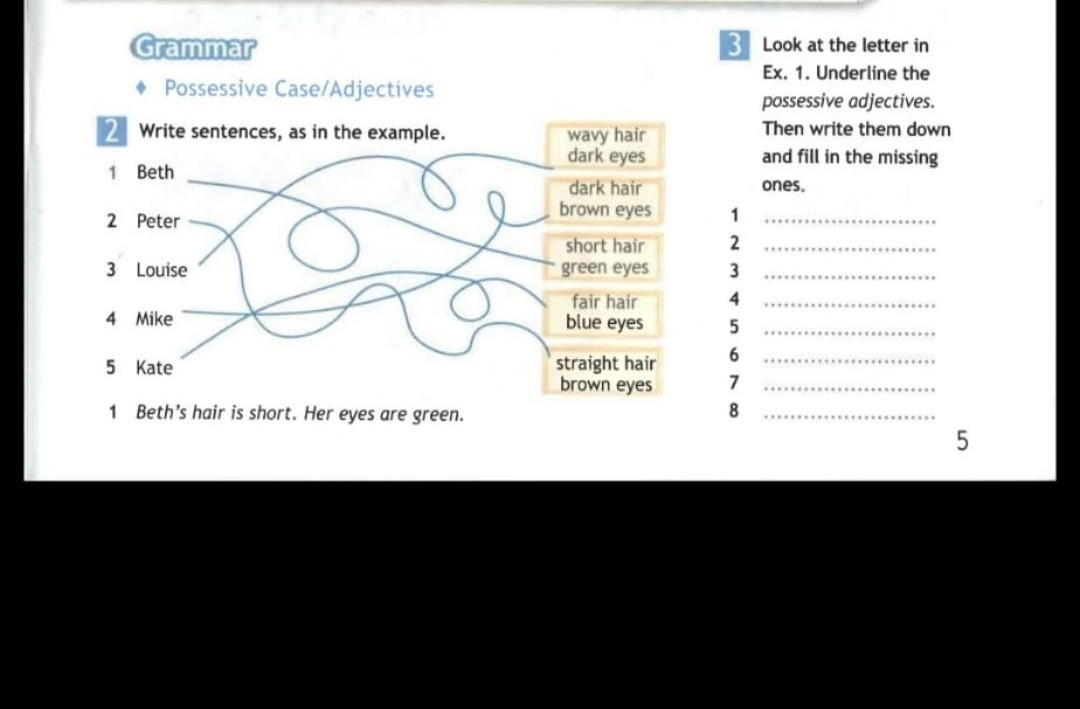 2. Peter has straight hair. His eyes are brown. 3. Louise has wavy hair. Her eyes are dark. 4. Mike has dark hair. His eyes are brown. 5. Kate has fair hair. Her eyes are blue.