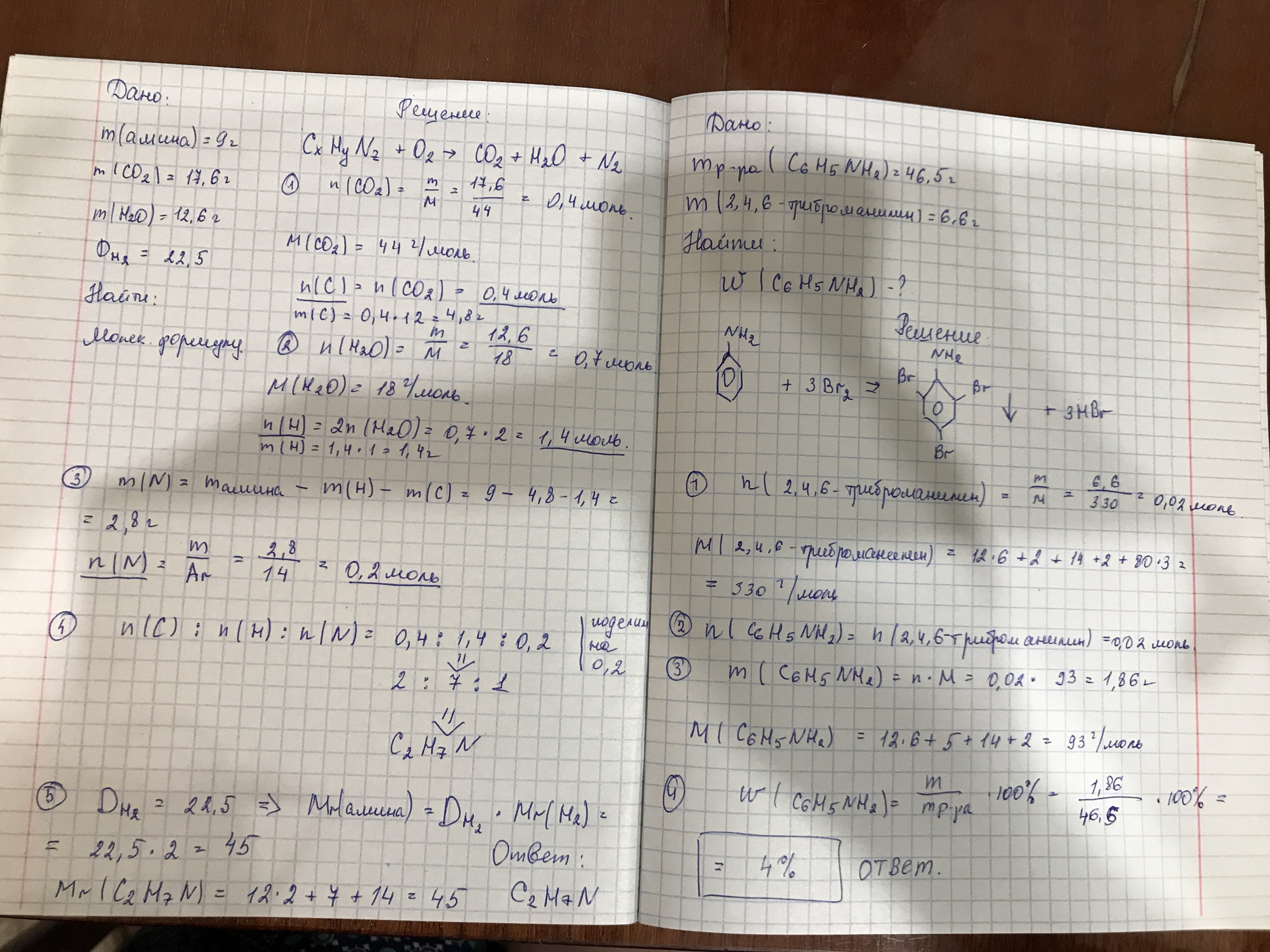 2)9 г амина образует при сжигании 17,6 г углекислого газа,12,6 г воды и азот.Относительная плотность по водороду 22,5.Вычислите формулу амина.