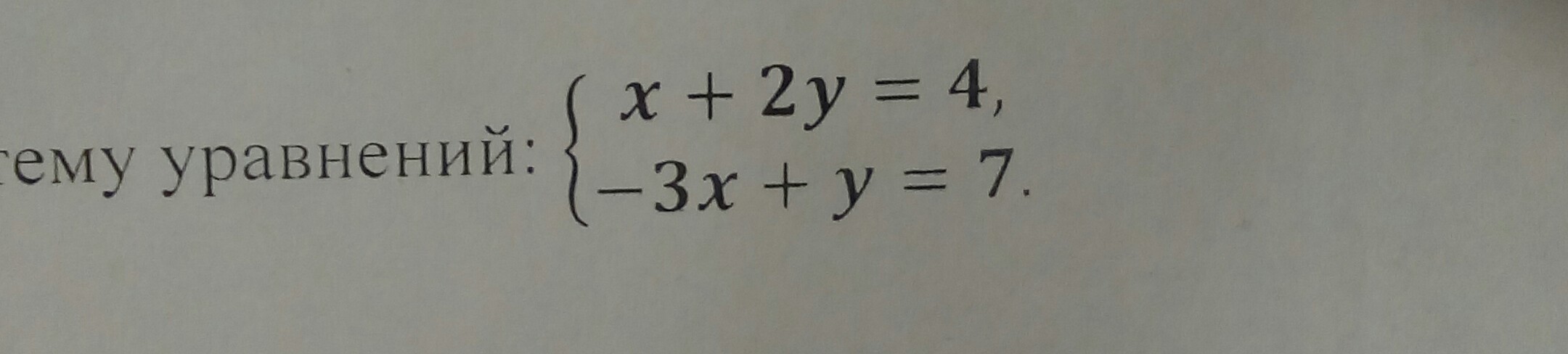 left { {{x+2y=4} atop {-3x+y=7}} right. \ x = 4 - 2y \ -3 (4-2y) + y = 7 \ -12+6y+y = 7 \ 7y = 7+12 \ 7y = 19 \ y = frac{19}{7} \ x = 4 - 2 * frac{19}{7} \ x = 4 - frac{38}{7} \ x= frac{-10}{7}