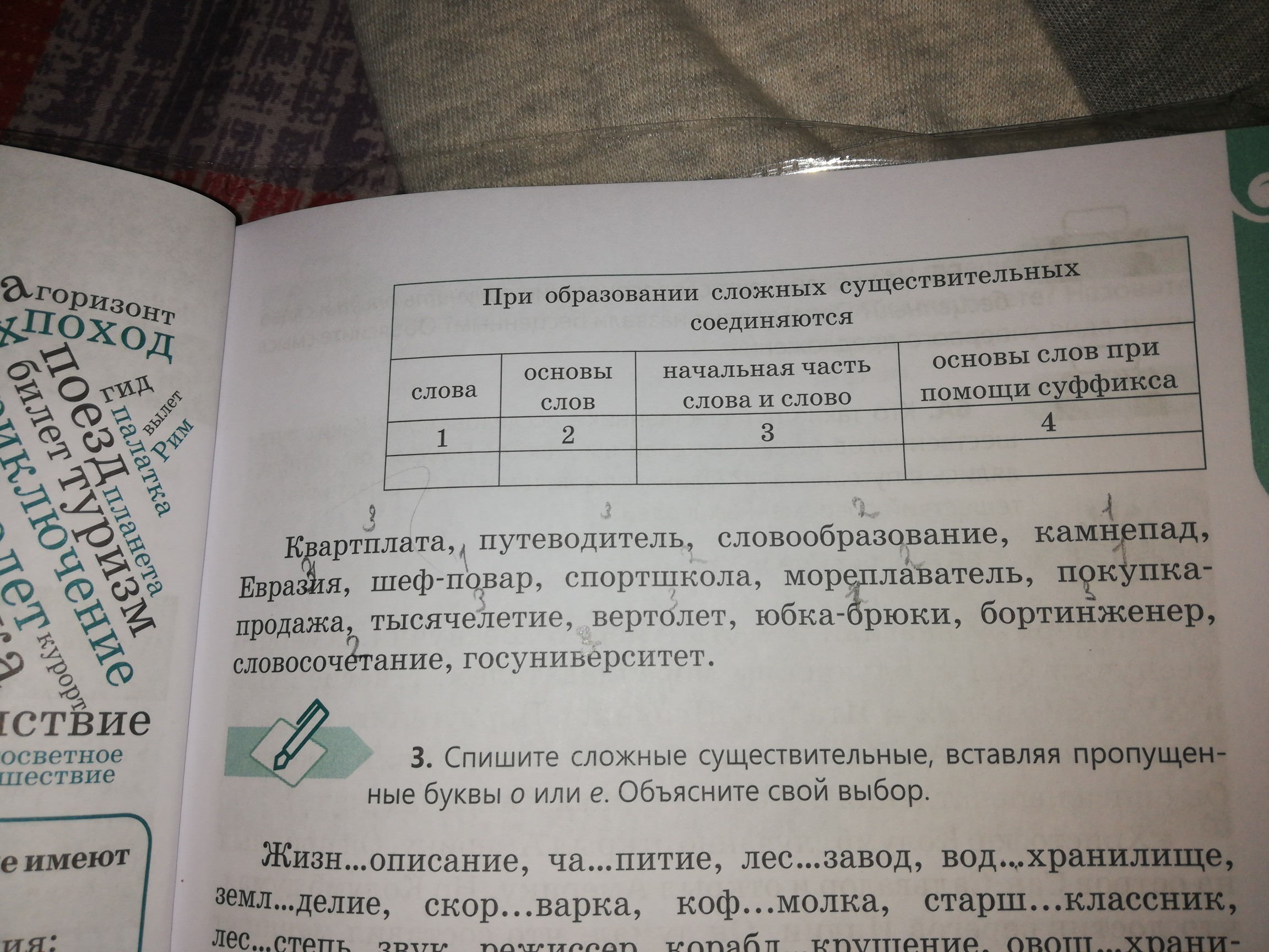 Квартплата--3, путеводитель- 3, словообразование-1, камнепад-4, Евразия- 3, шеф-повар-1, спортшкола-3, мореплаватель-1, покупка-продажа- 1, тысячетелие- 4, вертолет-3, юбка-брюки-1, бортинженер-3, словосочетание-1, госуниверситет-3