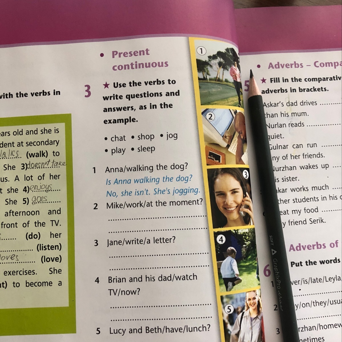 2. Is Mike working at the moment? No, he's sleeping 3. Is Jane writing a letter? No, she is talking on the phone 4. Are Brian and his dad watching TV now? No, they are running( на самом деле картинку не полностью видно, поэтому я точно не знаю, что они делают) 5. Are Lucy and Bath having lunch? No, they're walking ( та же проблема, что и в 4 - я не вижу, что они делают)