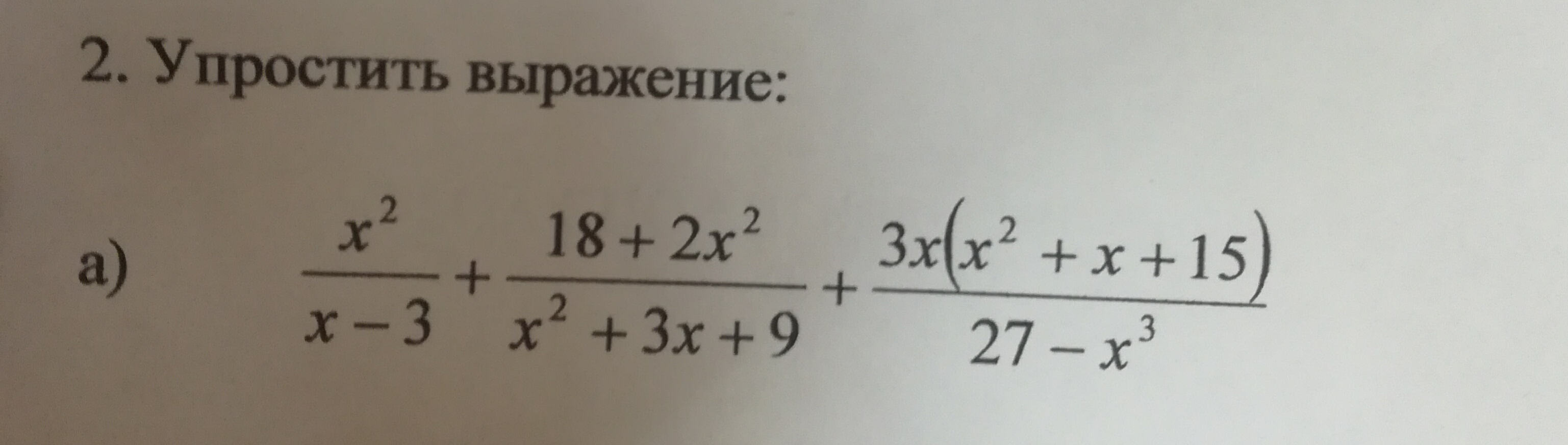 frac{ {x}^{2} }{x - 3}  +  frac{18 + 2 {x}^{2} }{ {x}^{2} + 3x + 9}  +  frac{3x( {x}^{2}  + x + 15)}{27 -  {x}^{3} }  =  frac{ {x}^{2} }{x - 3}  +  frac{18 + 2 {x}^{2} }{ {x}^{2} + 3x + 9}   -  frac{3x( {x}^{2}  + x + 15)}{  {x}^{3} - 27 } =  frac{ {x}^{2} ( {x}^{2}  + 3x + 9)}{(x - 3)( {x}^{2}  + 3x + 9)}  +  frac{(18 + 2 {x}^{2})(x - 3) }{( x - 3)( {x}^{2} + 3x + 9) }   -  frac{3x( {x}^{2}  + x + 15)}{ (x - 3)( {x}^{2}   + 3x + 9)}  =  frac{ {x}^{4}  + 3 {x}^{3} + 9 {x}^{2} + 18x + 2 {x}^{3} - 54 - 6 {x}^{2}  - 3 {x}^{3}  - 3 {x}^{2}  - 45x   }{(x - 3)( {x}^{2} + 3x + 9) }  =  frac{ {x}^{4} + 2 {x}^{3}   - 27x - 54  }{?}  = frac{ {x}^{3} (x + 2) - 27(x + 2)}{(x - 3)( {x}^{2}  + 3x + 9)}   =  frac{(x + 2)( {x}^{3}  - 27)}{ {x}^{3}  - 27}  = x + 2