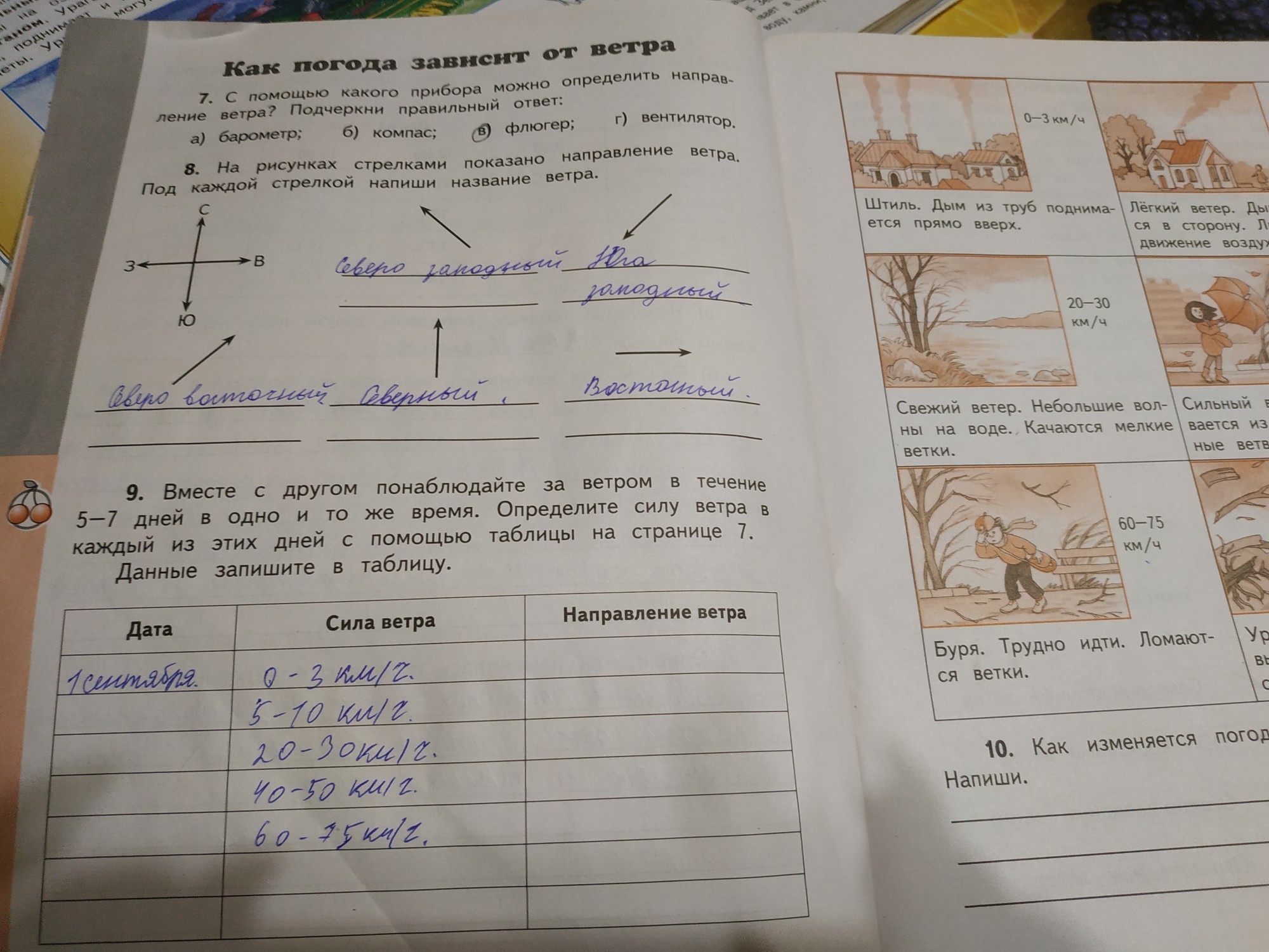 Нужно было наблюдать в какую сторону дует ветер. Север, Юг, Запад, Восток. Если не помните можно написать наугад но это будет заметно среди остальных которые это записали (Можно посмотреть в прогнозе погоды, там написано)