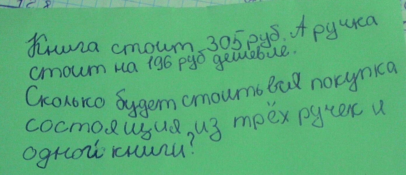 1)305-196=109руб стоит одна ручка,нам нужно 3 таких ручки,значит 3*109руб=327;2) 305+327=627руб-будет стоить вся покупка.