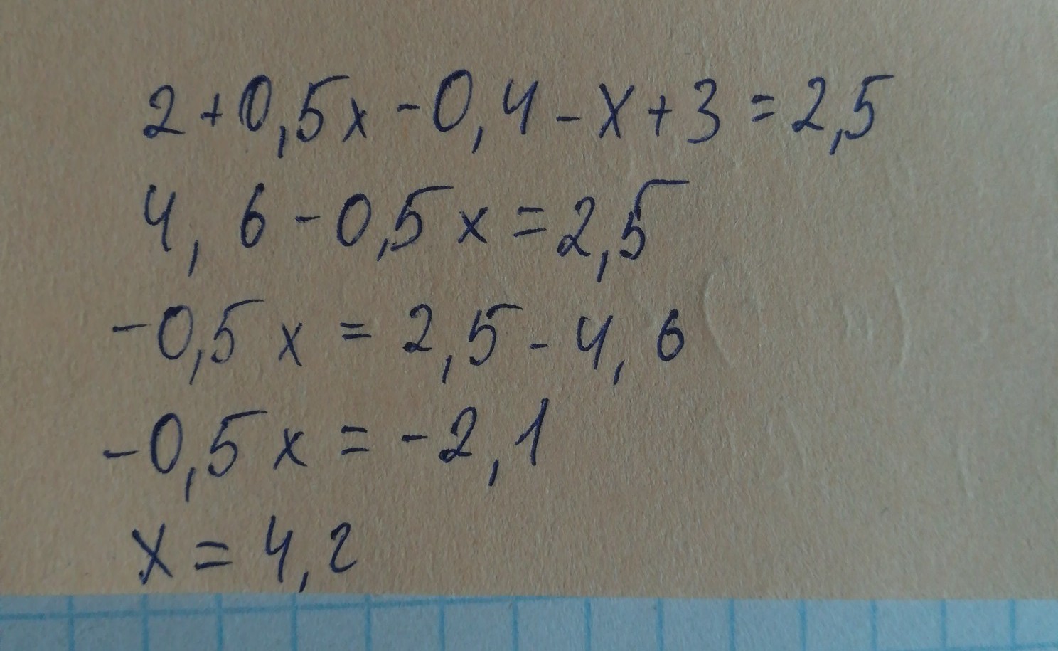 2+0.5х-0.4-х+3=2.5 Объясню почему вместо минуса стал плюс, потому что есть такое правило, если перед скобкой стоит знак плюс, то знаки остаются прежними, а в данном случае был знак минус, это значит,что мы должны поменять знак на противоположный, например если плюс, то минус.Теперь мы переносим числа без х в правую сторону, изменяя знаки. а с х оставим в левой части. Получается 0.5х-х=2.5-2+0.4-3