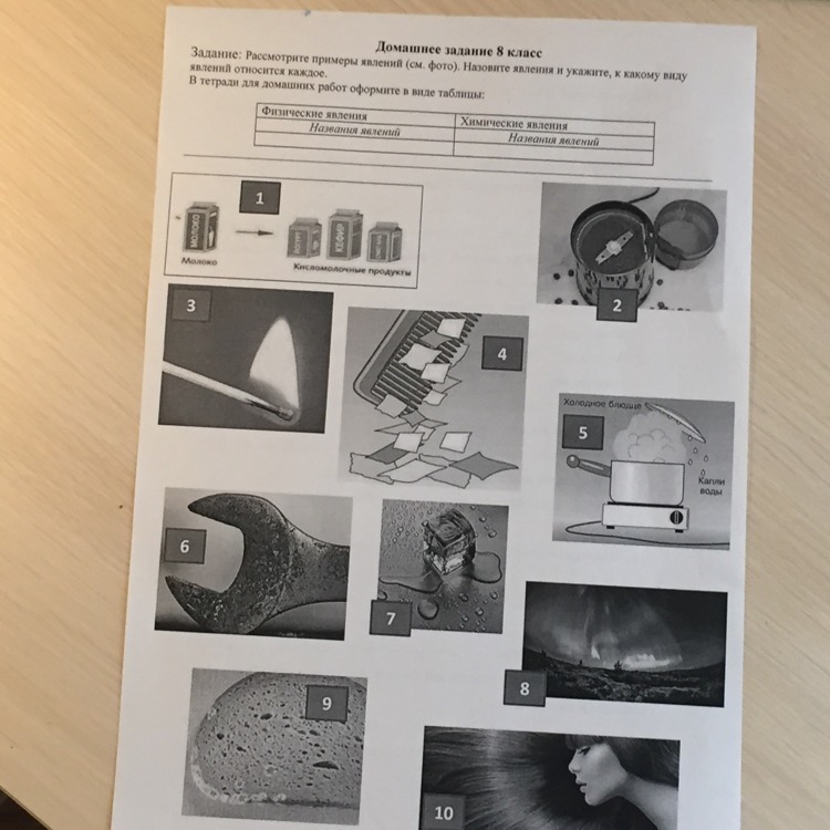 Физ: 2 (я не поняла что это... окрашивание? если да, то физическое), 4 (видимо бумажки электризуются), 5,7,8 , 10 (это что , выпрямление волос?)