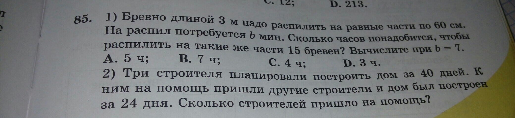 1) 300/60=5 частей, 4 распила/бревно, 4*b/60час/бревно, (b/15)*15=b часов на 15 бревен, при b=7 уйдет 7 часов -ответВ