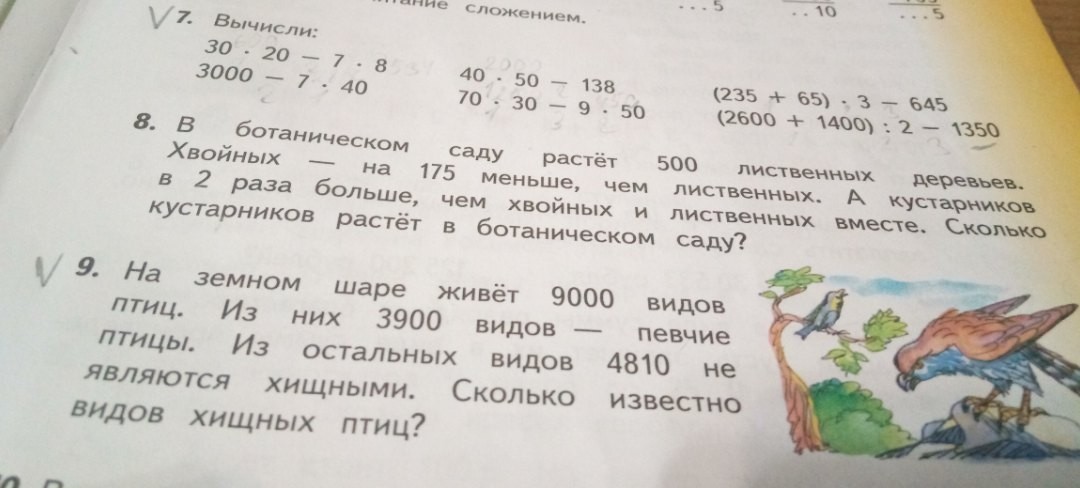30*20-7*8=544 3000-7*40=2720 40*50-138=1862 70*30-9*50=1650 (235+65)*3-645=255 (2600+1400)/2-1350=650 9000-(3900+4810)=290видов хищных птиц