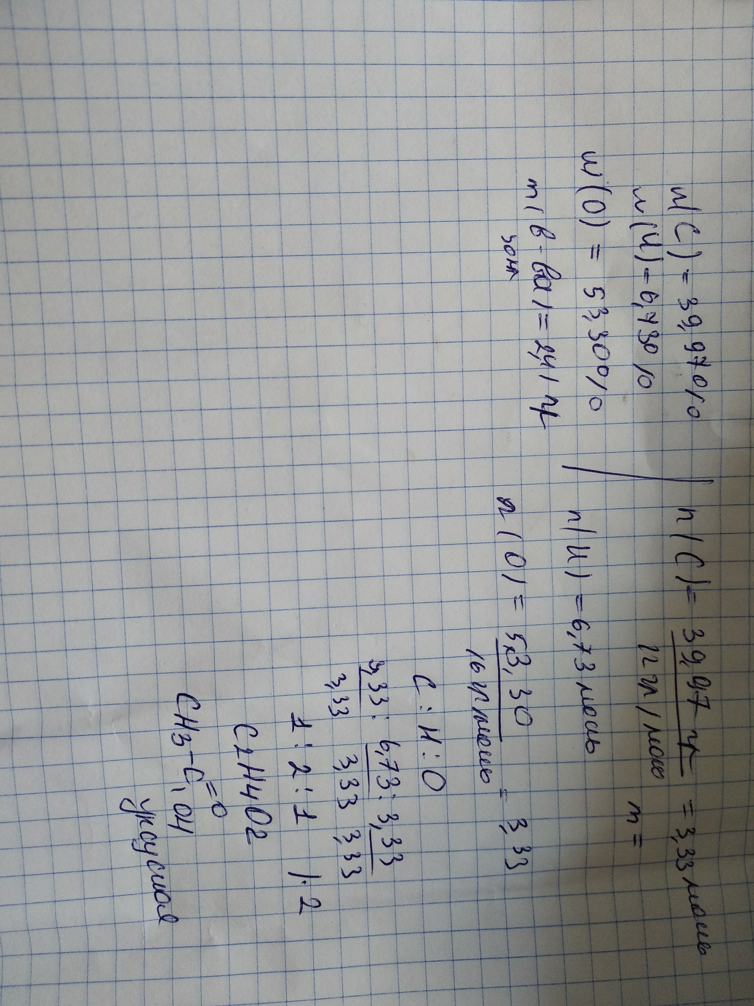 .Массовая доля углерода в соединении равна 39,97 %, водорода 6, 73 %, кислорода 53,30 %. Масса 300 мл. (н.у.) этого соединения равна 2,41 г. Выведите молекулярную формулу этого вещества.