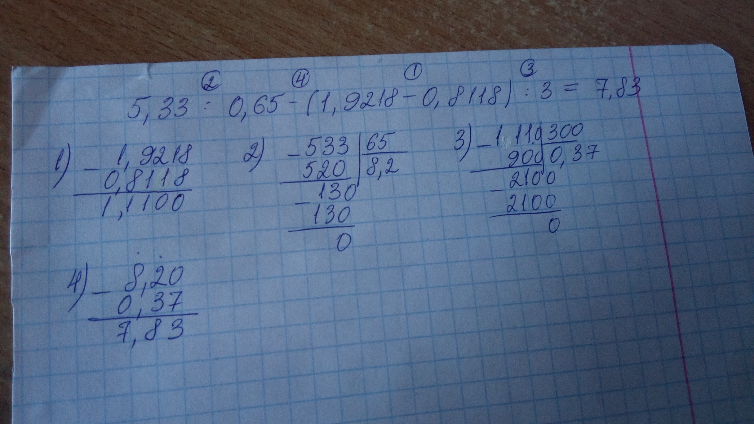 2) 5,33:0,65-(1,9218-0,8118):3=?