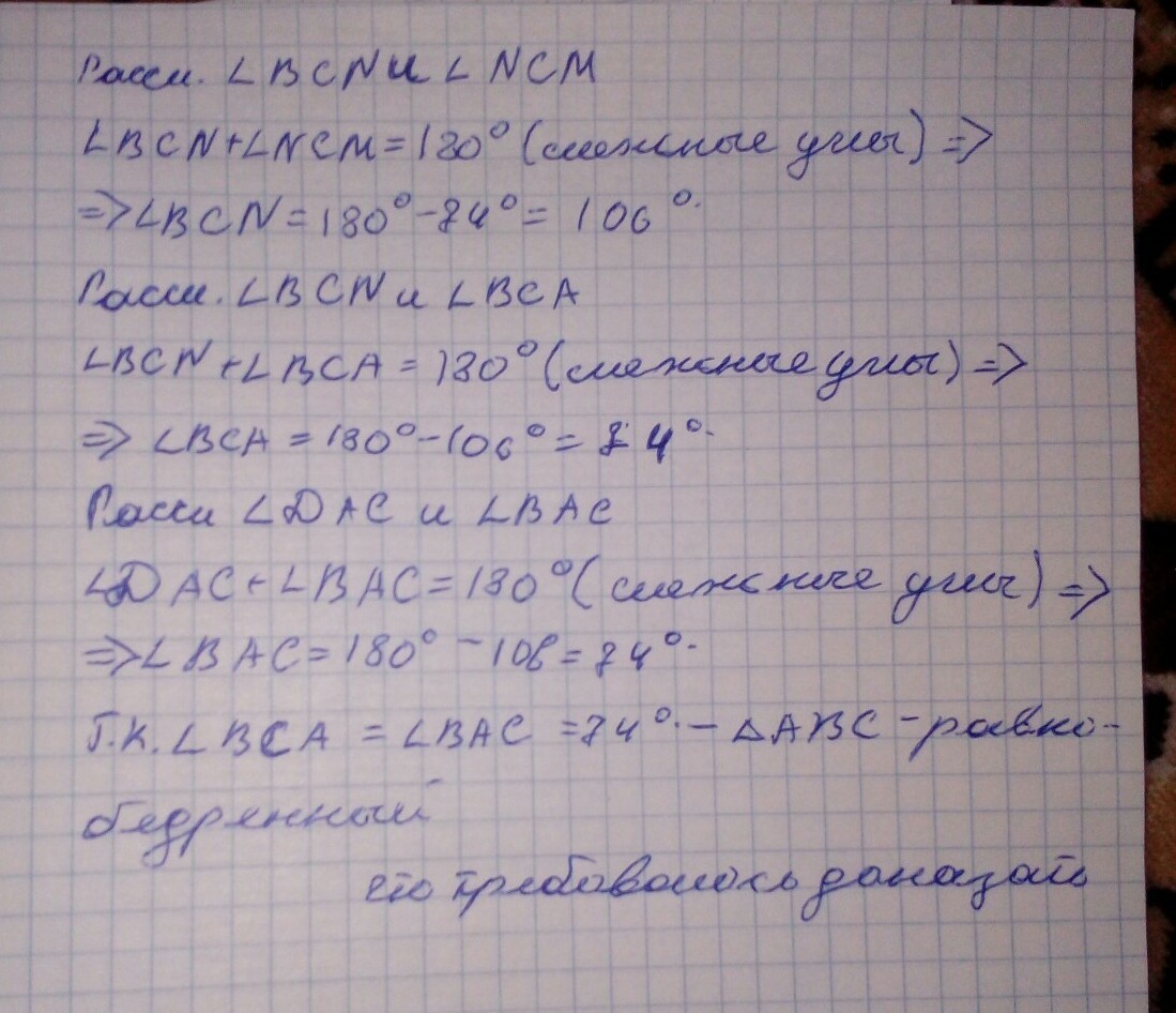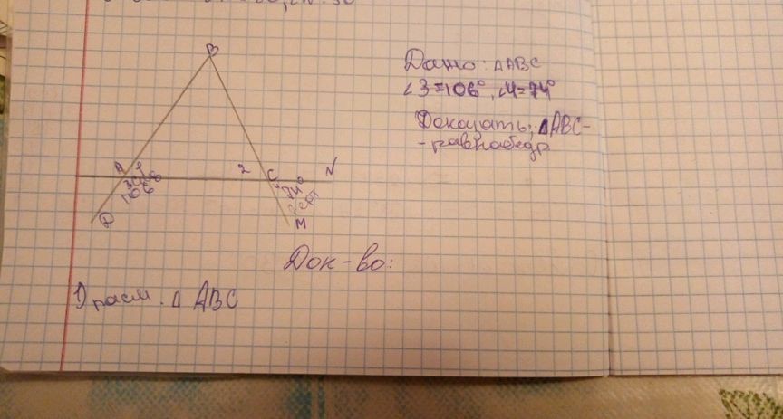 Необходимо доказать, что угол 1 и угол 2 равны. Угол 1 и угол 3 смежные. Сумма смежных углов равна 180° Находим угол 1 180°-106°=74° Угол 2 и угол 4 вертикальные. Т.к. вертикальные углы равны угол 2 равен 74° Итак угол 1 и угол 2 равны.
