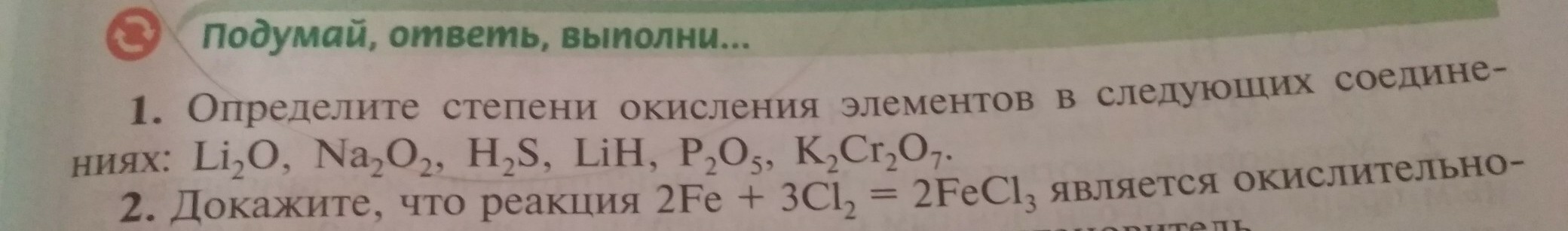 У кислорода постоянная степень окисления -2 , значит в Li2O У лития +1 , а у кислорода -2 (у лития кстати тоже постоянная степень окисления) Na2O2 - у натрия +2 , в у кислорода все так же -2 H2S - У водорода всегда +1 , у серы в этом соединении -2 , так как уже есть два плюса то и должно быть два минуса LiH - У водорода -1 , у лития +1 (тут исключение для водорода) P2O5 - 5 кислорода , у него -2 = умножаем на 5 , получаем 10 минусов , значит должно быть 10 плюсов , видим , что фосфора два - 10 делим на 2 получаем 5 , значит у фосфора степень окисления +5 (надеюсь понятно) K2Cr2O7 - у калия постоянная +1 и кислорода постоянная -2 , пока что мы имеем два плюса и четырнадцать минусов , складываем получается, что минусов стало 12 , значит у Cr степень окисления - +6 Объясняю , если не понятно. В веществах плюсов и минусов должно быть нейтрально. То есть - H2SO4 - два плюса и восемь минусов , сера тут одна значит - два плюс -8 получаем -6, осталось 6 минусов , значит у серы +6 Получается водород +1 , а его у нас два в формуле , у серы +6 и кислорода -2 , а кислорода четыри , значит всего 8 минусов . Ух, надеюсь ты понял.
