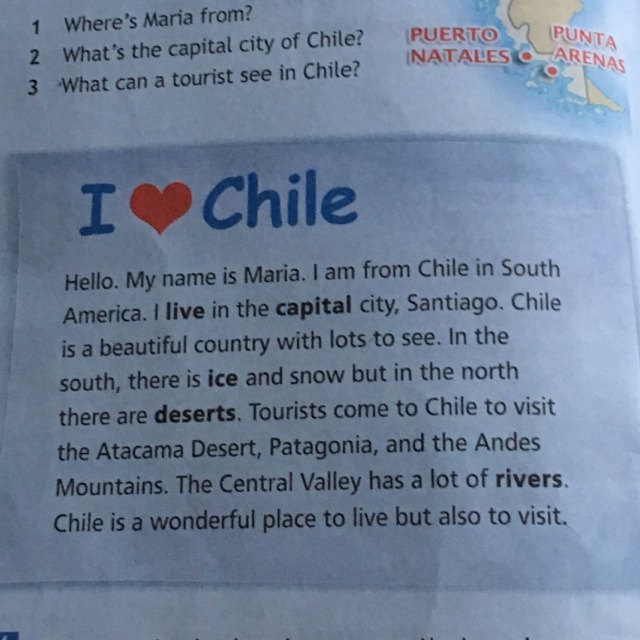 Привет. меня зовут Мария. Я из Чили в Южной Америке. Живу в столице, город Сантьяго. Чили - красивая страна, там есть много чего посмотреть. На юге - лед со снегом, на севере - пустыни. Туристы приезжают в Чили, чтобы посетить пустыню Атакама, Патагонию и горы Анды. В центральной долине много рек. Чили - удивительное место для проживания и туризма.