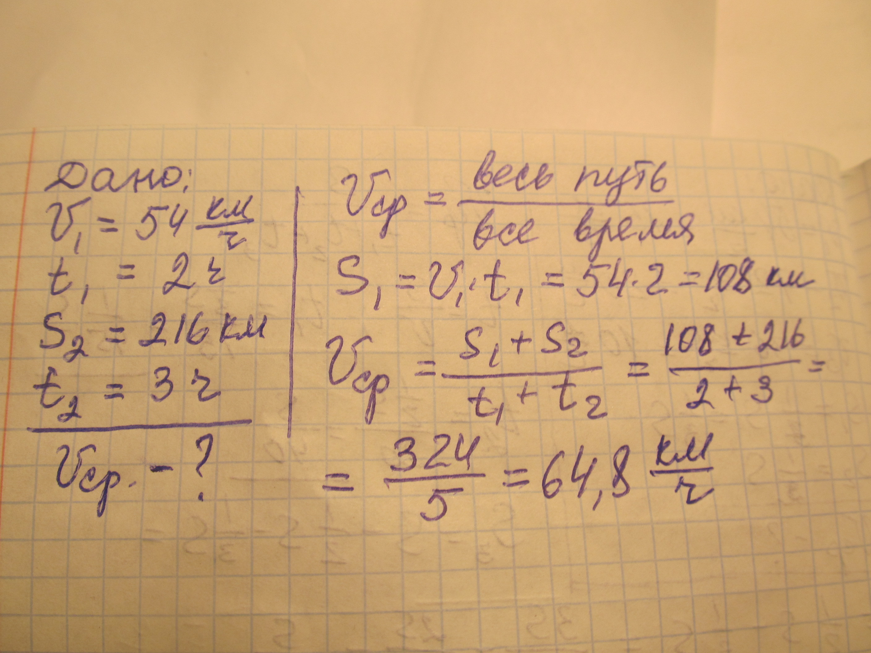 Первый участок пути поезд проходит со скоростью 54 км/ч за 2 часа,остальной путь 216 км,за 3 часа,определить среднюю скорость движения поезда.