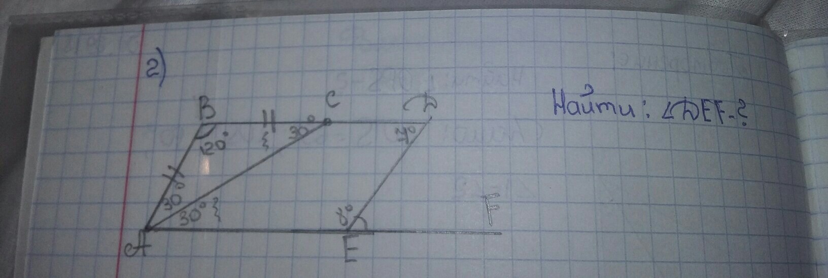 Столько же сколько и угол D. Так как накрест лежащие углы будут равны.