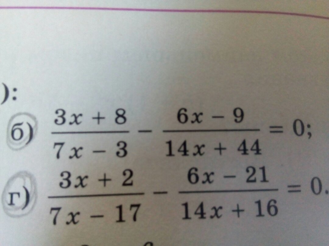 (3x+8)/(7x-3) - (6x-9)/(14x+44) = [(3x+8)(14x+44) - (6x-9)(7x-3)]/(14x+44)(7x-3) = не будем тащить знаменатель (он нам дал одз) и только числитель равняется 0 = (42х² + 132х + 112х + 352) - (42х² - 18х - 63х + 27) = 42х² + 244х + 352 - 42х² + 81х - 27 = 325х + 325 = 0