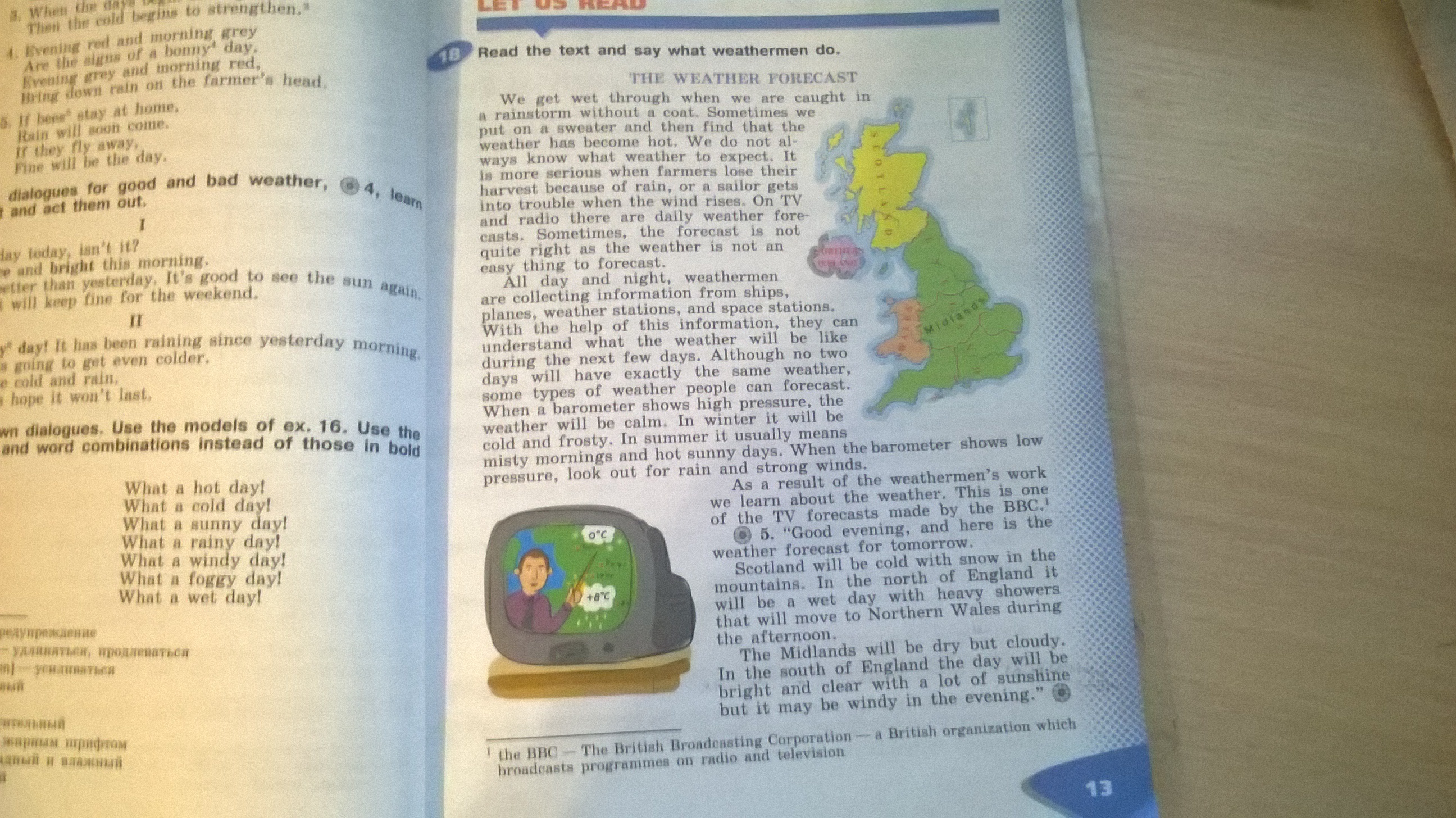 5. «Добрый вечер, и вот прогноз погоды на завтра. В Шотландии будет холодно и будет идти снег в горах. На севере Англии будет сыро с сильными ливнями, которые продвинуться в Северный Уэльс к полудню. В Мидлендс будет сухо, но облачно. На юге Англии день будет ярким и ясным с большим количеством солнечного света, но вечером может быть ветрено ».
