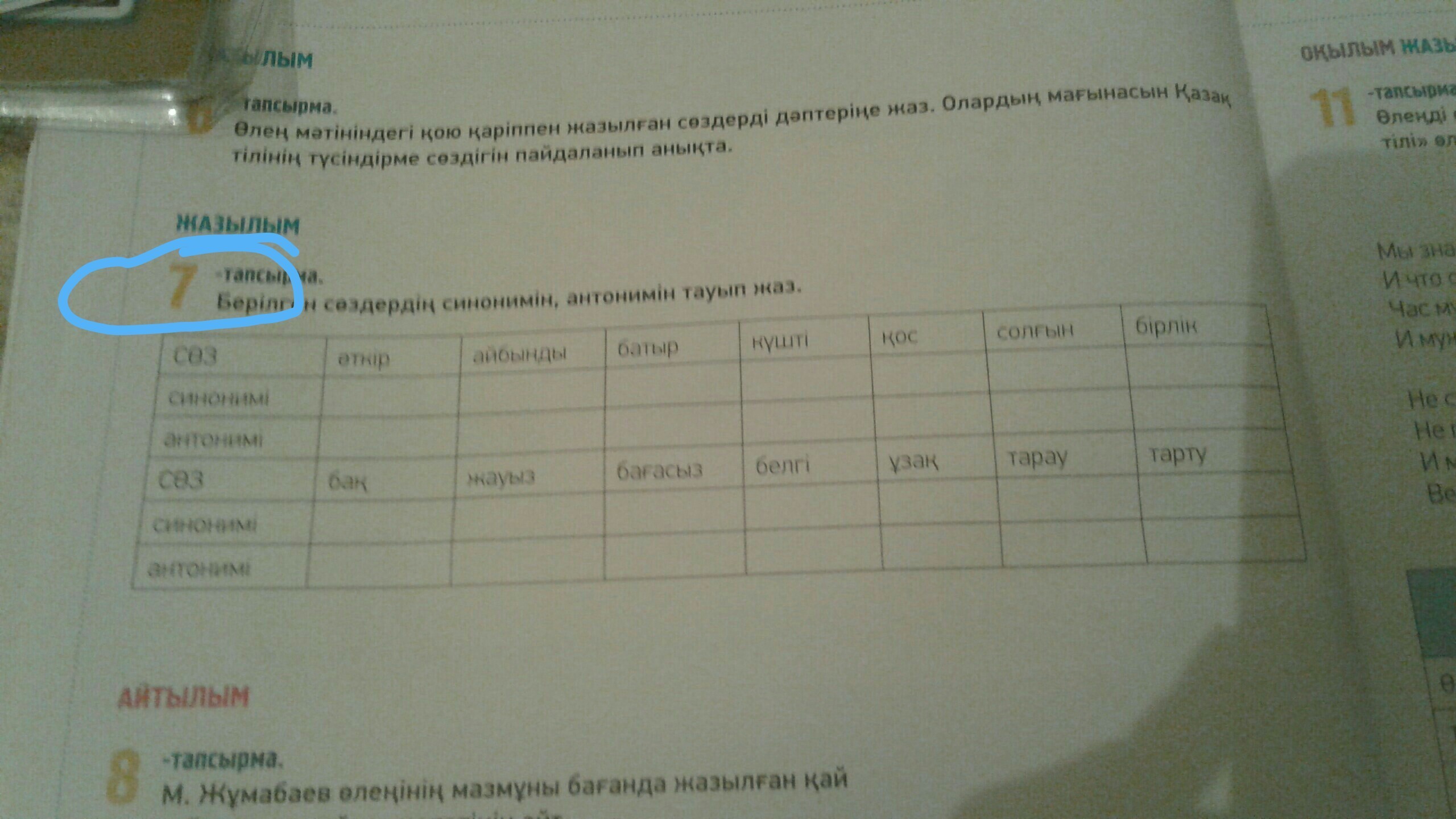 Айбынды-айбарлыды, Батыр-ержүрек, Қос-бірге, Бірлік-татулық Өтірік-жалған. Антонимдары : Айбынды-қорқақ, батыр-сужүрек, Қос-бөлек, бірлік-алауыздық отірік-шындық